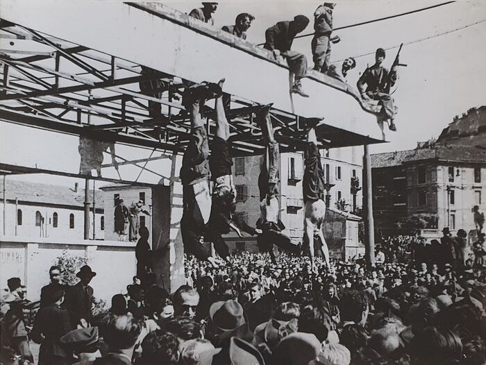Deze beroemde afbeelding toont Benito Mussolini opgehangen (het tweede lichaam van links) op het Loreto-plein in Milaan, 29 april 1945. Naast de Italiaanse leider, aan de rechterkant, zijn metgezel Clara Petacci. Ze stierven neergeschoten de dag voor deze tentoonstelling van de lichamen.