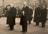 Persfoto van het bezoek van Sir Winston Churchill aan België. Op de foto het bezoek aan het graf van de onbekende soldaat.