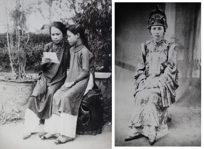 Twee originele foto's van rond 1920. van Annamitische vrouwen (Annam, historische regio op het grondgebied van het huidige Vietnam)