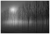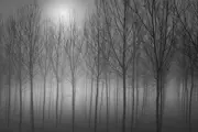 Winterlandschap bij het eerste ochtendgloren, de zon filtert moeizaam haar stralen door de mist en verwarmt de populieren. Landschappen tussen de rivieren Olio en Po. Foto uitgereikt op Hipa in 2018