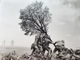Op de voorgrond planten soldaten een boom en op de achtergrond windturbines.