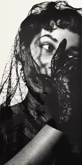 Prachtige opname, alles in schaduwen en licht, die een mooie vrouw in een sjaal en kanten handschoen voorstelt.