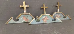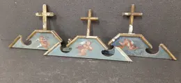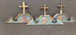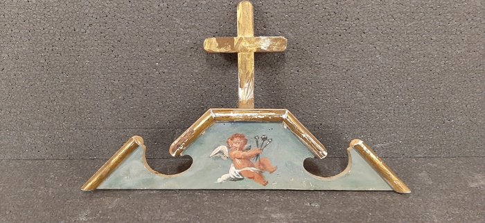 3 eindstukken van lijsten met houten kruis en geschilderd tegen het einde van de 19e eeuw. De centrale spiegels zijn beschilderd met motieven van vliegende engelen met een turquoise achtergrond, gouden randen en kruisen. Graag wil ik wijzen op enkele kleine gebreken in de vergulding en een kleine lijst (zie foto). Op de achterkant zijn er labels van een oude lijstenmaker uit Bergamo, patina van de tijd en afmetingen van 33x8 cm, inclusief de kruizen 33x19 cm.