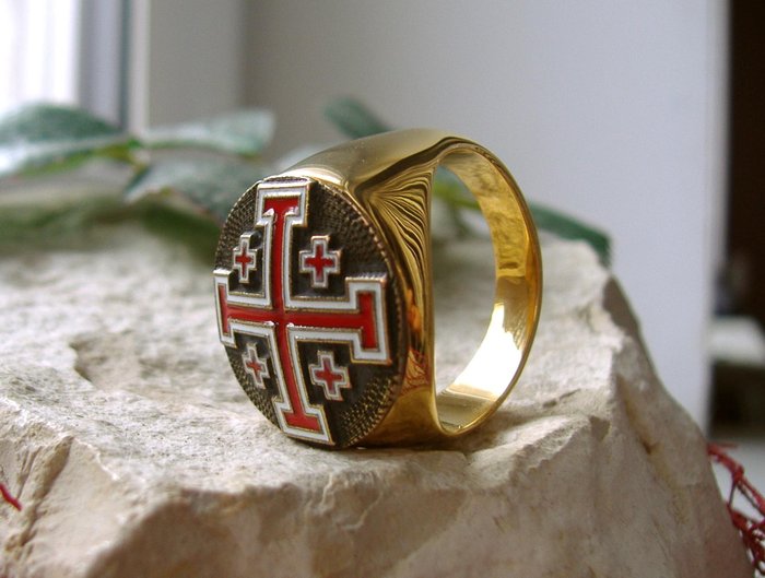 Deze ring is prachtig vervaardigd en minutieus gedetailleerd met een groot kruis van Jeruzalem in het midden en rond kleine kruisjes van 4 stuks. Prachtig geëmailleerde rode kruizen op een witte achtergrond. Echt kunstwerk.