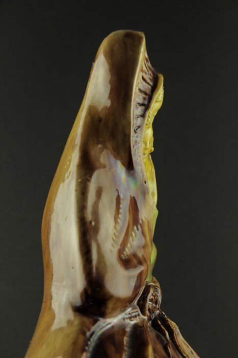 Beeld in de typische stijlvan het Vlaams aardewerk, hier afgewerkt in bruin, okerkleurig en groen gecraqueleerd glazuur. Kenmerkend zijn ook de imperfecties en barsten van bij de productie.