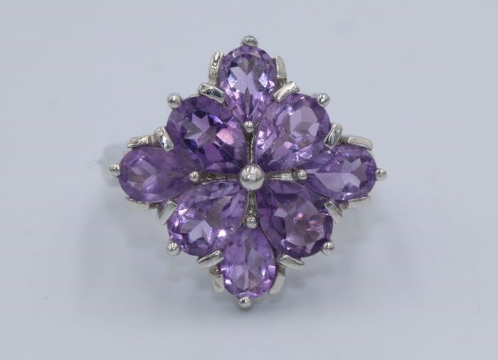Zilveren ring bezet met natuurlijke gefacetteerde amethist.