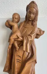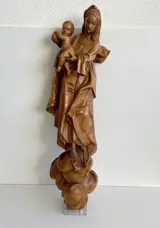 - Prachtig antieke handgestoken houten beeld van Maria en Jezus. Het beeld is gemaakt tijdens het begin van de 20e eeuw. Maria staat met haar voet op een draak, iets wat een bijzondere uitbeelding is. Het beeld is gemaakt in Duitsland.
