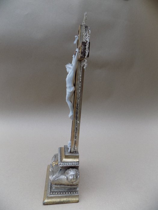 Antiek houten kruisbeeld , goud geschilderd , op houten voet en omvat met metalen filigraanwerk . Christusfiguur , INRI bordje en memento moriaan de voet van het kruis zijn in bisquit porselein . Onderaan op de voet zijdelings aan beide kanten een putti-hoofd . Vooraan afbeelding van gevleugelde monstrans . Houten kruisvorm binnenin uitgehold en zilverkleurig .