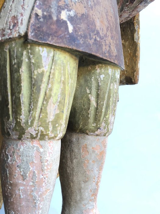 Nieuwsgierig beeld met kinderthema gemaakt van gebeeldhouwd, gestuukt en polychroom hout. Op achthoekige houten voet. De wijzers ontbreken maar het blijft een uitzonderlijk decoratiestuk. De verf hecht perfect op het hout en het is een zeer stabiel beeld. De kop is gemonteerd in de rest van het lichaam (deze is afneembaar).