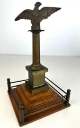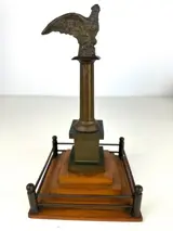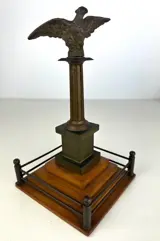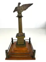 Prachtig bronzen beeld voorstellende een adelaar op een zuil rustend op een houten voet.