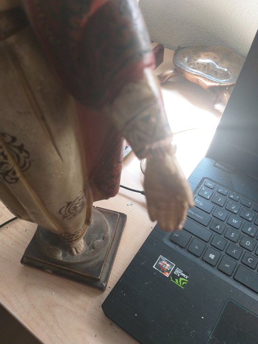 Oud Heilig Hart van Jezus van eerste kwaliteit gemaakt van polychroom houtpasta met de hand, op een houten voet en glazen ogen door een van de beroemdste kunstenaars van het prestigieuze huis van Olot. Uniek verzamelstuk dat niet in massa is geproduceerd met uitzonderlijke kwaliteit van details en materialen.Nauwkeurige restauratie met één hand die bij de kavel is inbegrepen.Meting zonder kroon 45cm