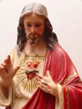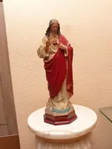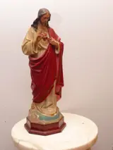 Oud Heilig Hart van Jezus van eerste kwaliteit gemaakt van polychroom houtpasta met de hand, op een houten voet en glazen ogen door een van de beroemdste kunstenaars van het prestigieuze huis van Olot. Uniek verzamelobject, geen massaproductie met uitzonderlijke kwaliteit van details en materialen.