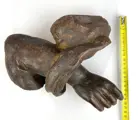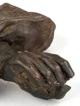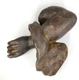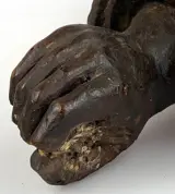 Oud houten fragment dat een arm afbeeldt.