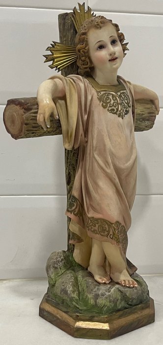 Oude verzegelde religieuze figuur van het gekruisigde kind Jezus uit het beroemde huis van Olot gemaakt door een ambachtsman eind 19e eeuw, begin 20e eeuw, in houtpulp met glazen ogen op een houten voetstuk met een koperen halo. Een echt, uniek en onherhaalbaar juweel, met de hand gemaakt en gepolychromeerd. UITZONDERLIJK STUK VAN HOGE WAARDE VOOR ZIJN KWALITEIT. Het vertoont geen restauratie, wat het een grotere waarde geeft.