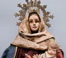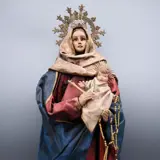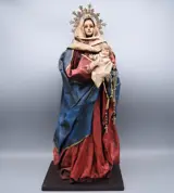 Oud beeld - Maagd met het Kind gemaakt van kartonnen stof op een houten voet.