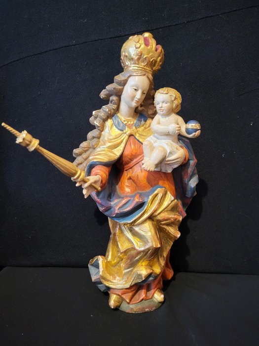 Maria in een rood gewaad en een mantel die van binnen blauw en van buiten goud is. Ze draagt een grote kroon. In haar handen houdt ze Jezus vast, met een bol in zijn hand. Het houtsnijwerk en de houtstructuur zijn mooi zichtbaar.