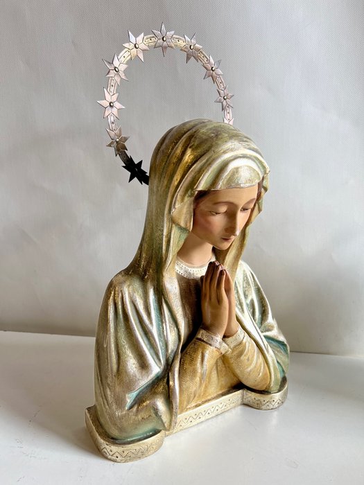 Sculptuur "Maagd van Fatima" -- Gips, Pasta en hout, Teder gezicht, met opengewerkte kroon gegraveerde versiering - sgraffito-versiering in zilver- en goudtinten.