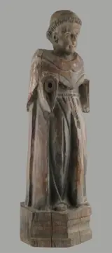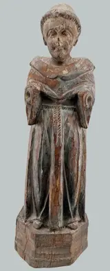 Dit houten beeld stelt Sant'Antoni Abate voor. Antonio werd geboren in Come in Egypt in 151. Op twintigjarige leeftijd verkocht hij al zijn bezittingen om een kluizenaarsleven als asceet te leiden, in eenzaamheid levend in het verlaten fort van Pispir, waarbij hij allerlei verleidingen doorstond en doorstond. De groeiende roem bracht hem ertoe het hermitische leven op te geven om voor de talrijke gelovigen te zorgen. In navolging van de middeleeuwse iconografie wordt de heilige afgebeeld met het klassieke monnikspij en het kapsel terwijl hij zijn armen spreidt als een teken van zegen (afwezige onderarmen zijn nu verloren). De slanke figuur is vakkundig gesneden: het diepe clair-obscur dat uit de plooien van het habijt komt, herstelt een licht volume, de krullen van het haar, licht veerkrachtig, en de oprechte uitdrukking die de heilige aanneemt, tonen de plastische vaardigheid van de beeldhouwer. De kledingstukken worden gemaakt door kleurlagen aan te brengen waarvan nog duidelijke sporen te zien zijn, de kunstenaar probeert dankzij bekwame lichte aanrakingen het idee van een kostbare damaststof na te bootsen.