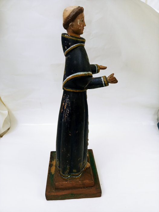 Een prachtig sacraal beeld van een monnik van hout, polychroom beschilderd uit de 19e eeuw, de staat op de foto's, de rechterhand is gelijmd.