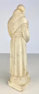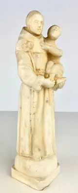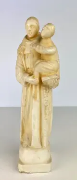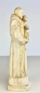 Oud marmeren beeld van een heilige met een kind in zijn armen.