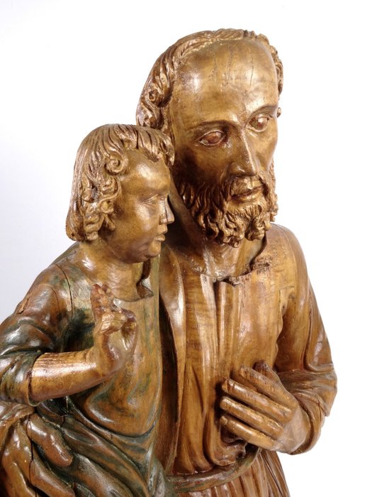 Groot 18e-eeuws Duits beeld van St. Jozef die het kleine kind Jezus draagt. Hoogwaardig snijwerk in lindehout, gebeitst en gelakt. De oude krijt- en verflagen zijn in het verleden verwijderd, maar zijn op sommige plekken nog zichtbaar. Handgeschreven tekst in de Duitse taal op de achterkant, gedateerd 1927. Hoogte 61 cm. Gewicht 9 kg.