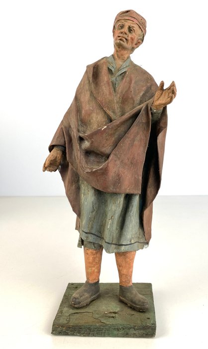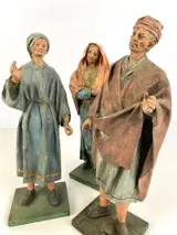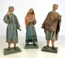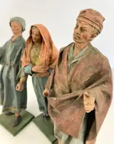 Groep van drie oude sculpturen in papier-machet met personages uit de wieg op houten sokkels.