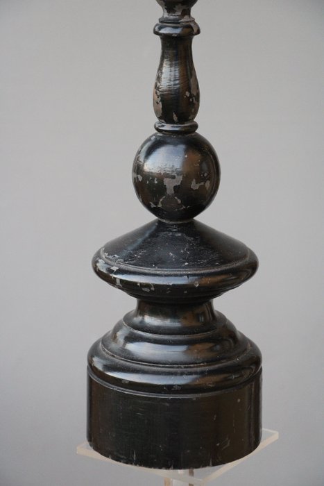 Bijzonder kruis in Historicisme stijl. Gemaakt van hout en zwart geverfd. (Diverse plekken is de verf beschadigd). Toch is het een zeer bijzonder kruis omdat je deze uitvoering bijna nooit ziet met de rondingen. Het kruis is inclusief de voet 60cm hoog. Het Christus figuur is gemaakt van metaal, waarschijnlijk ijzer en dan verguld. Verguldsel is nog liht zichtbaar.