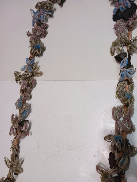 Grote boog met bloemen voor "Madonna's" of "heiligen" gemaakt in Italië aan het einde van de 19e eeuw volgens de populaire stijl. Gewoonlijk was de constructie en de realisatie van deze bogen met kralenbloemen in verschillende kleuren de taak van de kloosterzusters, het duurde maanden om er een van deze maat te maken, ze zijn vrij zeldzaam, velen werden in de loop van de tijd aangepast aan kleinere maten. De condities zijn zoals op de foto's, de meeste zijn aanwezig, het vereist een simpele satijnen tape op het ijzeren gedeelte.De hoogte is 119 cm en de breedte is 39 cm.