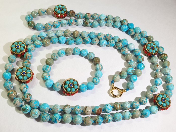 Exclusieve ketting en armband van hoge kwaliteit blauwe keizerlijke jaspis met 6 Tibetaans boeddhistische amuletten ter bescherming (gezondheid, geluk & fortuin).