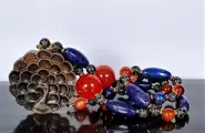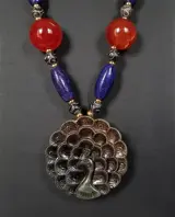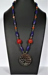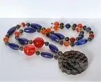 Boeddhistische beschermingsketting, samengesteld uit natuurlijke kralen in een verscheidenheid aan serpentijn, lapis lazuli, carneool en zwarte agaat.