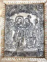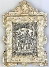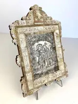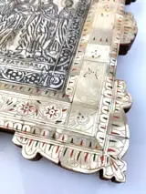 Schitterende gegraveerde parelmoeren plaquette met een religieus tafereel.