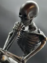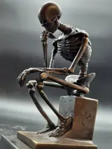 Het skelet zit op een grafsteen in de denkhouding die op een echt marmerblok is geplaatst en is nieuw.