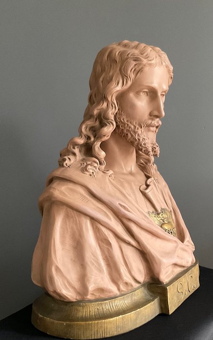 Extra groot borstbeeld Jezus Christus in Terracotta uit België eind 19e eeuw gesigneerd