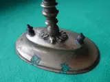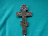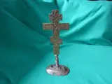 Een bronzen Russisch-orthodox iconenkruis met een centrale reliëfvoorstelling van de Kruisiging van Christus, waaromheen afbeeldingen van de Mandulion, twee engelen, vier kruisigingsgetuigen, en daaronder de schedel van Adam op Golgotha. Aan de achterzijde voorzien van bloemvoorstellingen in reliëf. Rusland, datering 19e eeuw. Afmeting 190 x 104 mm. Deze staat op een standaard. Totale afmeting is 29,5x12,5x7,5 cm. Zie ookde foto's.