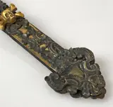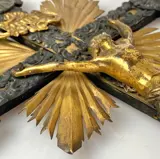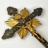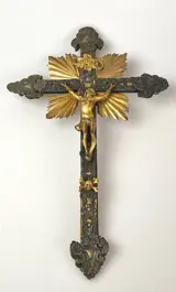 Verfijnde verguld bronzen Christus op een houten kruis bedekt met fijn reliëf metalen platen.