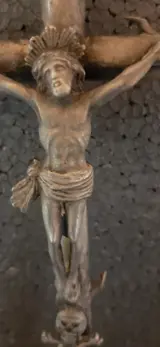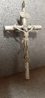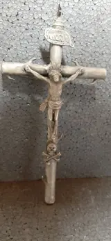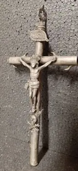 Klein zilveren kruisbeeld uit het midden van de jaren 1800. Typisch object dat door kardinalen of bisschoppen om de nek wordt gedragen vanwege de grootte, het kan nodig worden schoongemaakt. In het bovenste gedeelte (haak) bevinden zich 4 stoten in een ruit, waaronder die met de wereld omringd door sterren, een typische negentiende-eeuwse stoot van het Lombardo-Veneto-koninkrijk. Afmeting 19x9 cm.