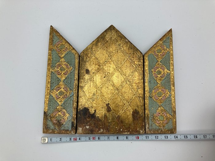 Antieke drieluiken (staand altaar, altaarstuk) handbeschilderd en voorzien van bladgoud. Beste heilige handwerk! Deze werken komen uit een woningopruiming en waren jarenlang vitrinestukken.