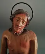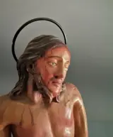Ecce Homo - Sculptuur in polychroom terracotta, glazen ogen, op verguld houten voetstuk.