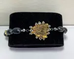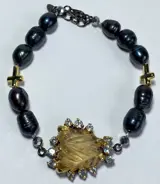 Exclusieve armband van Black Pearl met Citrien (15 kt) en Blue Topaz ,TOP KWALITEIT, met kruisjes van Sterling Zilver 925.