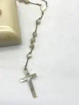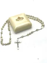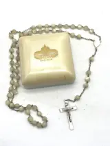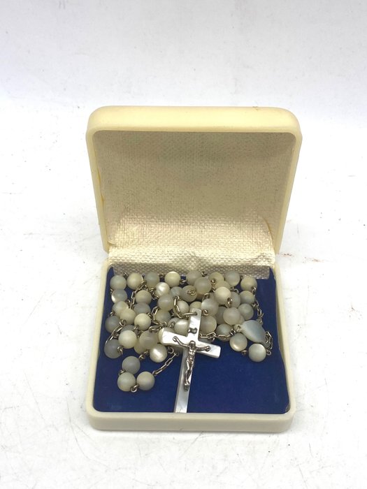 Parelmoer rozenkrans met doos met wapenschild van de Eeuwige Stad Basiliek San Pietro Rome gevonden in een Romeinse christelijke familie
