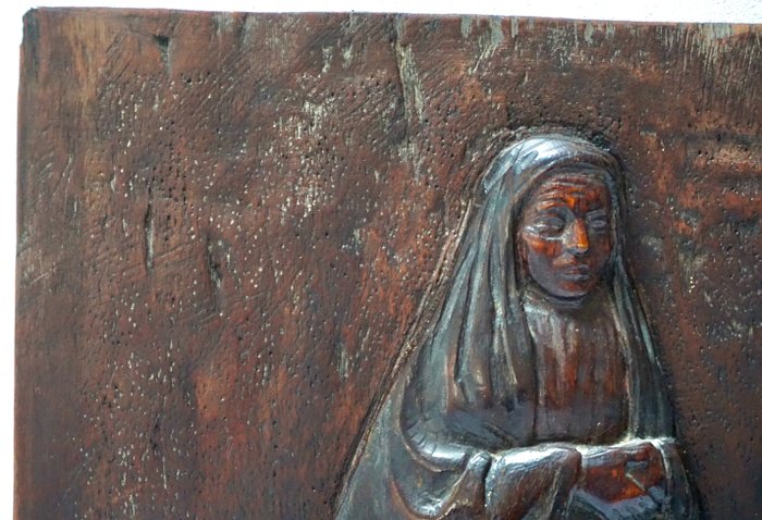 Zeer fraai eikenhouten beeld van Madonna, gemonteerd op houten plank, gelakt, gemaakt door Italiaanse beeldhouwkunst F. Gatti. Gedateerd 1935. Handgesneden. Gesigneerd en gedateerd door insnijding, rechtsonder op board.