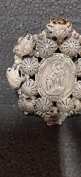 Rozet in 800 zilveren filigraan uit de late jaren 1800. Artefact uit het Siciliaanse gebied, waar grote meester-goudsmeden zilver bewerkten om onder andere prachtige filigraan-objecten te maken. Aan de ene kant verschijnt het doopsel van Jezus in het midden en de Heilige Familie aan de andere kant. Er zijn 2 keurmerken, waarvan er één de zilveren titel "800" heeft, in de tweede twee initialen en precies "VM". Het kan nodig worden schoongemaakt, met afmetingen van 11x10 cm. Ik wijs erop dat sommige bladeren licht gebogen zijn maar gemakkelijk kunnen worden opgevangen.