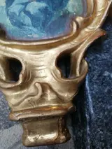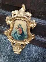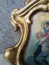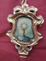 Houten cymatium gesneden en beschilderd aan beide zijden: een met een zonnestraal monstrans en hostie, de andere met de Maagd en het Kind. Het houten gedeelte is van puur goud (bladgoud). Afmeting 30x18x5cm.