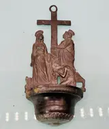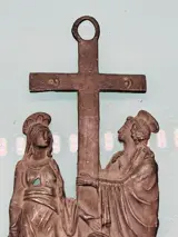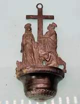 Heilige Maagd Maria en Jezus gemaakt van tin metaal met de hand afgewerkt naar de smaak van de barokstijl. Het is een prachtig religieus lettertype met een mooie oude patina.