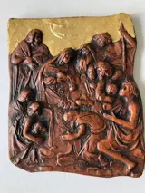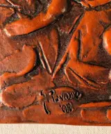 Artistiek bas-reliëf in terracotta gesigneerd door de kunstenaar. Gemodelleerd in een enkel exemplaar door de meester-beeldhouwer Giuseppe Pavone. Terracotta afgewerkt door de auteur ook met het gebruik van bladgoud, het vertegenwoordigt de geboorte van Christus aanbeden door de herders. Het terracotta bas-reliëf is gemonteerd op een paneel van gemiddelde dichtheid en heeft de handtekening in het midden onderaan. De foto's, een integraal onderdeel van de beschrijving, tonen een kerststal die de evangelische boodschap verheerlijkt, waarbij de gebaren van de afgebeelde personages een gevoel van stille heiligheid vormen. Het object is aangekocht op een tentoonstelling van de beeldhouwer en verkeert in perfecte staat. Zorgvuldige en aangetekende verzending