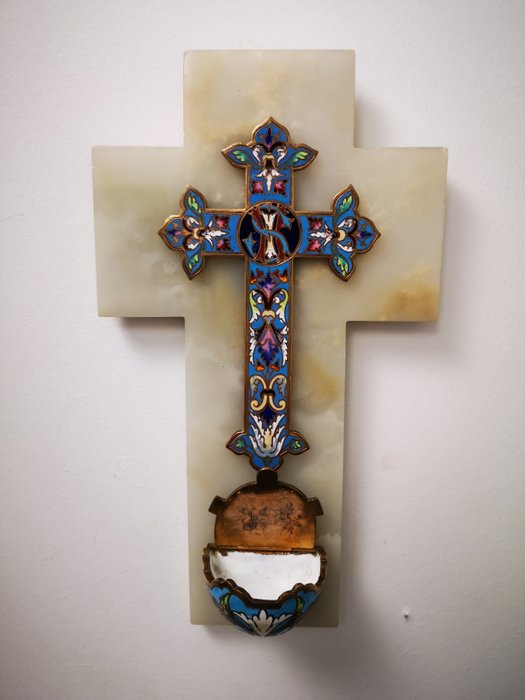 Groot kruis in cloisonné-email "ook wel chemplevé genoemd" Napoleon III (19e eeuw). Wit onyx marmeren kruis bevestigd op messing plaat. Geëmailleerd in florale stijl op brons bevestigd. De vorm van de schelp is ongebruikelijk.