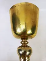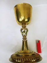 Een mooie grote bokaal met zilver 750 (12 lut) verguld, gesigneerd, goede staat, versleten verguldsel, kleine putjes op de voet, staat en signatuur weergegeven op de foto's die deel uitmaken van de beschrijving.