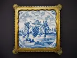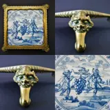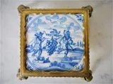 De messing omlijsting is zeer fraai bewerkt zodat de Delftsblauwe tegel er nog mooier in uitkomt.