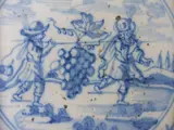 Een antieke Delftsblauwe tegel dienblad vide poche met De Verspieders / Druivendragers gezet in een messing omlijsting.