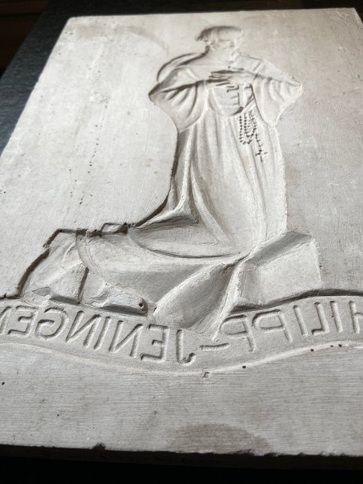 Het reliëf stelt Philipp Jeningen voor, die op 16 juli 2022 in Ellwangen voor de kapittelkerk St. Vitus zalig werd verklaard door de Luxemburgse kardinaalvoorzitter van de EU-bisschoppencommissie Jean-Claude Hollerich namens paus Franciscus. Volgens zijn dagboek had Jeningen opmerkelijke mystieke ervaringen met het hart van Jezus. Hij genoot tijdens zijn leven de reputatie een heilige te zijn, vooral vanwege zijn gave van genezing en het vermogen om gebeurtenissen te voorspellen, en werd door de bevolking altijd "goede pater Philipp" genoemd.Zie foto's voor conditie.